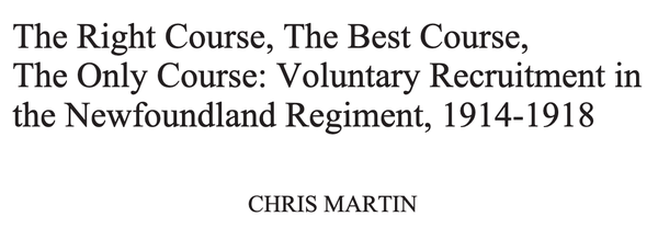 4th April 2009 The Right Course, The Best Course, The Only Course: Voluntary Recruitment in the Newfoundland Regiment, 1914-1918 Authored by Chris Martin and published in the Journal of Newfoundland & Labrador Studies in 2009.